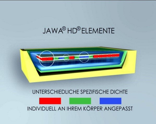 4. bei keinem der Nutzer, des JAWA HD®, wurden Rötungen oder Geschwürbildungen festgestellt, wie es nicht selten bei Bettlägerigkeit, speziell bei älteren Menschen, bei konventionellen Bettsystemen der Fall ist, die keine homogene Verteilung des Körpergewichts auf der Unterfederung ermöglichen;