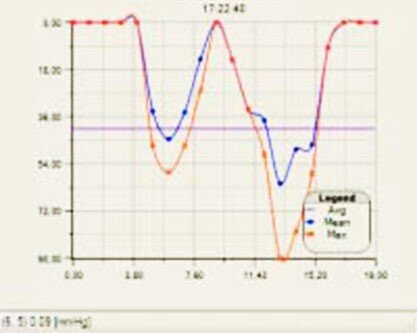 Mit dieser Option können die Daten in Bezug auf den Druck von den Schultern bis zu den Hüften als Kurve wiedergegeben werden. Die blaue Kurve gibt die Mittelwerte für jede Reihe an, die rote Kurve den max. Druck, der in jeder Reihe ermittelt wurde. Die horizontale Linie entspricht dem mittleren Druck auf der gesamten Messfläche.