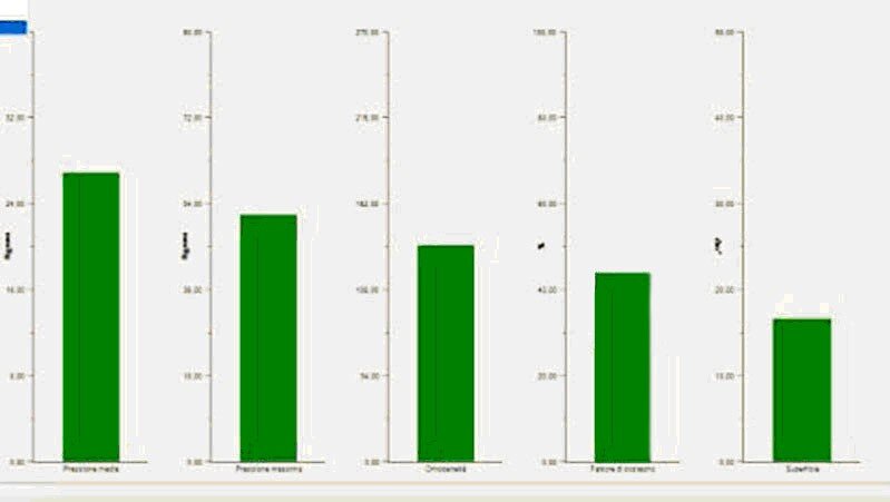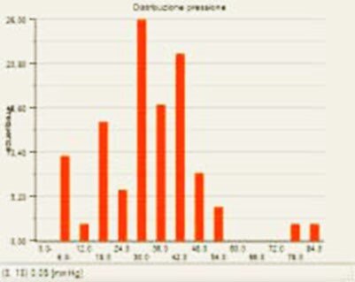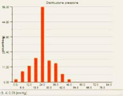 Mit der Darstellung als Balkendiagramm können die ausgeübten Drücke unterteilt werden. Das bedeutet, das Programm zeigt an, welcher Prozentsatz der Drücke sich innerhalb eines bestimmten Druckbereichs befindet. Das Diagramm gibt daher Aufschluss darüber, ob die ermittelten Drücke sich über einen großen Druckbereich erstrecken oder ob sie eher homogen sind und sich in einem annähernd gleichen Druckbereich bewegen.