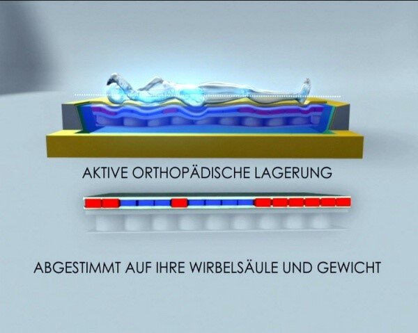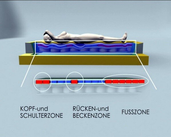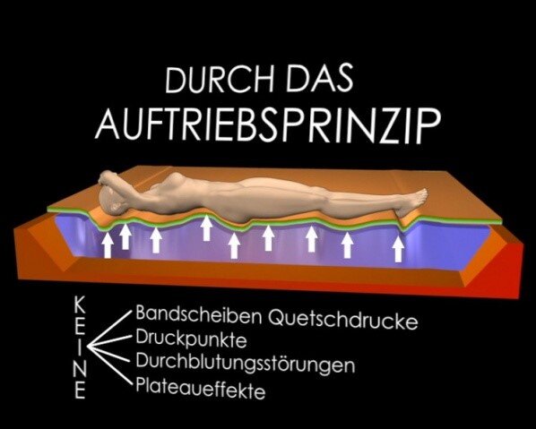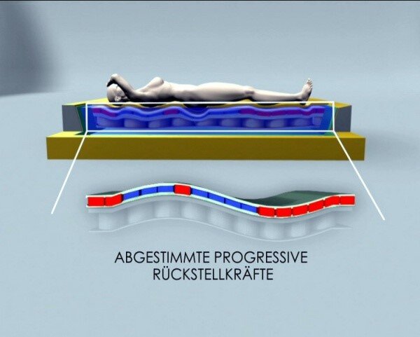 Im Wege der Selbstregulierung und Stabilisierung der Kräfte, die lotrecht auf die Liegefläche einwirken, wird der durch die größeren und schwereren Körperteile ausgeübte Druck in einen Druck zur Unterstützung der anatomisch leichteren Bereiche umgewandelt.